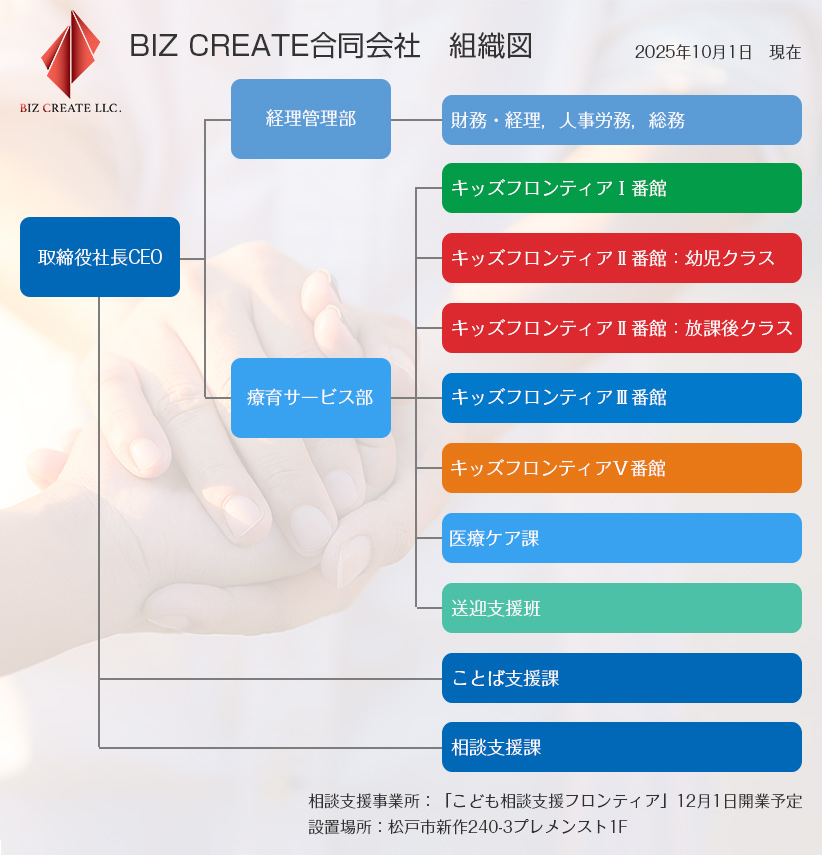| 平成28年9月 | 「障害児により充実した療育・支援を」を目的に障害児通所支援事業を専業とするBIZ CREATE合同会社を設立。 |